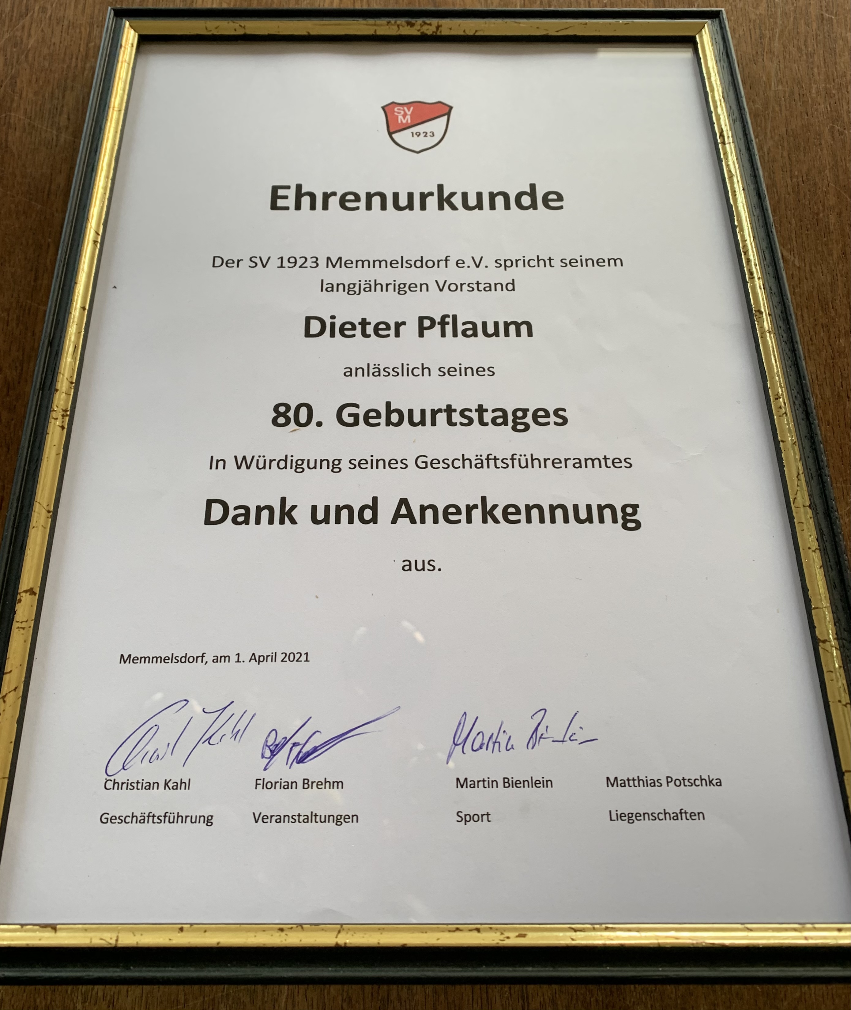 Zwei unserer neuen Vorstände haben ihn deshalb zuhause überrascht und ihm anlässlich seines 80sten die Ehrenurkunde für sein langjähriges Wirken im Amt des Geschäftsführers des SVM überreicht.