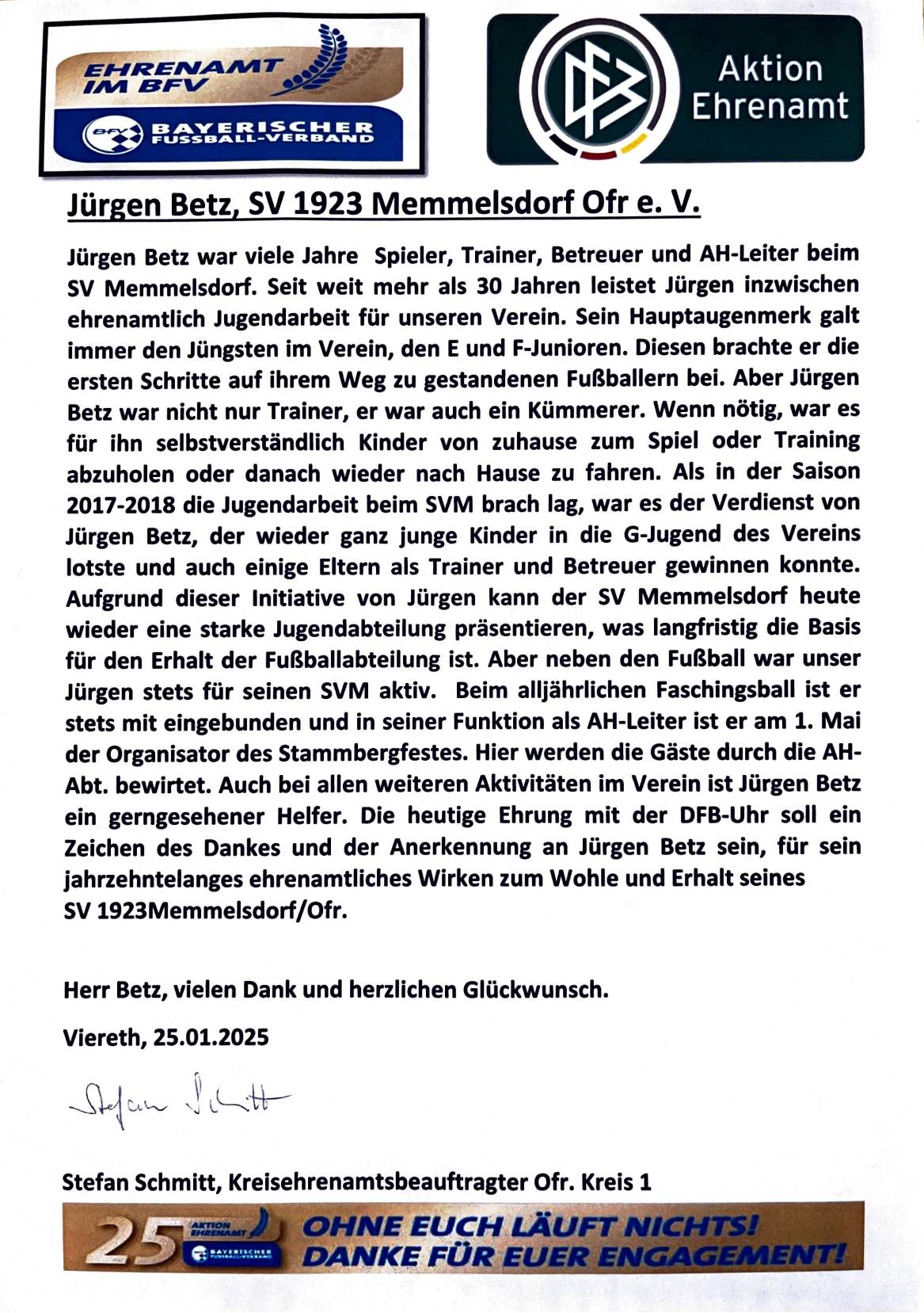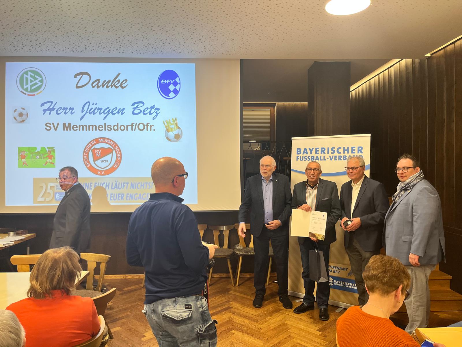 Jürgen Betz wurde am Samstag, den 25.01.2025 vom BFV für sein außergewöhnliches ehrenamtliches Engagement beim SV Memmelsdorf geehrt.