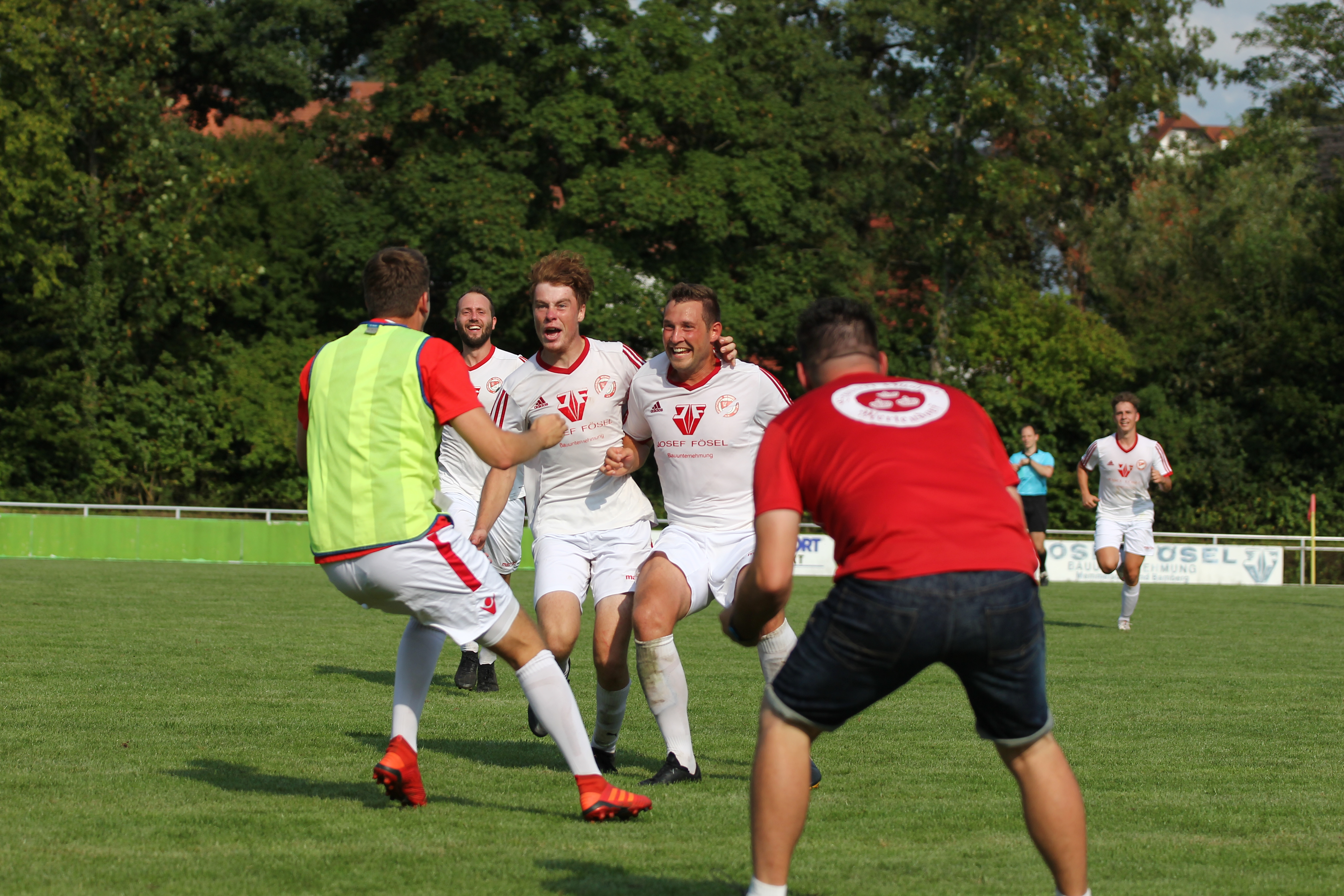 Umjubelter Siegtreffer in der Nachspielzeit Etwa zehn Minuten war der zweite Durchgang alt, als Memmelsdorfs Keeper Thomas Schuberth einen Lichtenfelser Freistoß zur Ecke über die Querlatte lenkte. Felix Lausch legte sich den Ball zurecht - und brachte ihn mit Zug in Richtung Tor. Klasse geschossen, hinweg über die vielen Köpfe im Fünfer, dazu der Blick in die Sonne. Dennoch sieht eben ein Keeper immer nicht ganz so glücklich aus, wenn ein Eckball direkt rein geht. Sei's drum, es stand 1:1 und es war noch mehr als eine halbe Stunde zu gehen. Im Anschluss an ihren Ausgleich wurden die Lichtenfelser aber eben nicht sicherer, sondern fabrizierten in den Folgeminuten zwei, drei leichte Aufbaufehler, die der SVM aus dem Zentrum heraus bei mehr Konsequenz hätte bestrafen können. Aber Fabian Trunk setzte den Ball einmal knapp am kurzen Pfosten vorbei, dazu schloss Lukas Schuberth einen von ihm selbst eingeleiteten Angriff aus aussichtsreicher Position zu zentral ab. Memmelsdorf optisch nun mit leichten Vorteilen, aber keinen entscheidenden. Denn mittlerweile standen beide Teams wieder sehr kompakt, Lichtenfels wurde dazu im Aufbauspiel wieder genauer und lud nicht mehr ein. So ging es in Richtung Schlusspfiff und in Richtung einer leistungsgerechten Punkteteilung. Gegen die hatte zunächst Luis Grasser etwas, als er es gegen den zum Spiel hin geschobenen Keeper Niklas Weise fast von der Mittellinie mit einem Heber versuchte, der auch ausreichend Zug hatte - und gepasst hätte. Aber Weise roch den Braten und klärte im Rückwärtslaufen vor der Linie. Insbesondere durch die Trinkpause und die Wechsel wurde freilich nachgespielt. Und diese Nachspielzeit brachte mit dem SV Memmelsdorf dann tatsächlich einen Sieger aus der Partie hervor. Verantwortlich war Spielertrainer Michael Wernsdorfer und sein linker Fuß. Mit dem setzte er nämlich einen Freistoß aus ca. 23 Metern ins vom Schützen aus gesehen rechte Eck des Lichtenfelser Tores. Kurz darauf war die Partie beendet und die Memmelsdorfer bejubelten ihren späten Kerwa-Sieg.